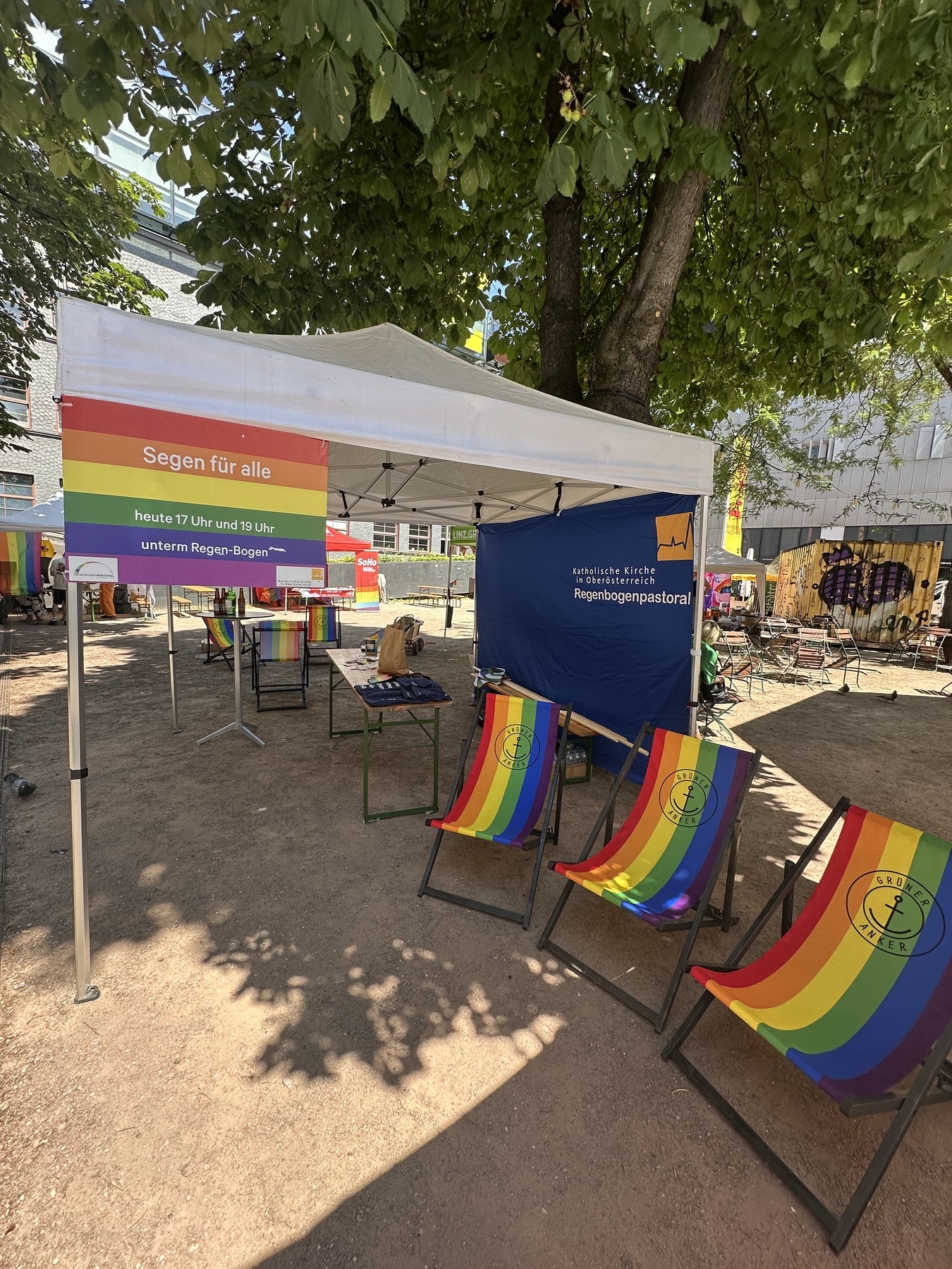 Der Informationsstand mit Segensspendung unter dem Regenbogen war im Anschluss an die Parade eine vielgenutzte Möglichkeit zur Information, zum Zuhören und zur Begegnung. „Es ist unsere Aufgabe auch in der Jugendpastoral, die Erfahrungen junger Menschen immer wieder neu zu thematisieren und in den gesellschaftlichen Kontext zu stellen. Die vielen noch immer bestehenden ‚Tabuthemen‘ (wie z. B. die Transpastoral) dürfen nicht länger verschwiegen werden. Wir können es uns nicht leisten, eine Kirche zu sein, die aus Angst vor öffentlicher Wahrnehmung die Zügel anzieht. Unser Platz ist bei den Ausgegrenzten, an den Rändern der Gesellschaft, dort, wo Begleitung und Hoffnung gebraucht werden“, schildert Anson Samuel, Geistlicher Assistent kjoö und Stadtjugendreferent der Diözese Linz.