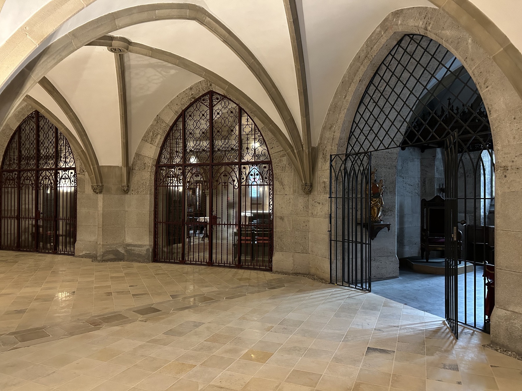 Neben den beiden Sakristeien führen Marmorstiegen in die Krypta, die unter der Votivkapelle einen Kapellenraum umschließt. Hier werden im Winter die Wochentagsgottesdienste und die Taufen gefeiert.