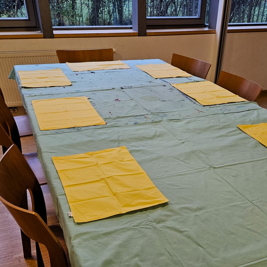 Die Servietten werden mit Papierklebeband auf den Tisch geklebt, so kann nichts verrutschen.