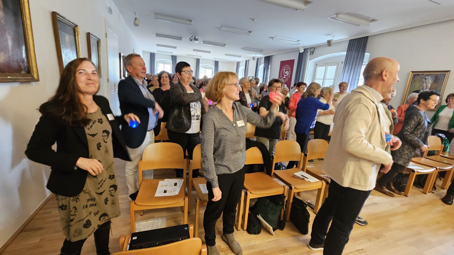 Theater ist nicht nur zum Zuschauen, sondern auch zum Mitmachen! Simone Rupp bietet vor Tanzvorstellungen beim Landestheater eine „Bewegte Einführung“ an. Das wurde bei der Tagung auch gleich ausprobiert. Sowohl Publikum im Saal als auch die Theater-Verantwortlichen auf der Bühne waren mit Begeisterung dabei (siehe Bildergalerie). Danke für den lustigen und bunten Input!